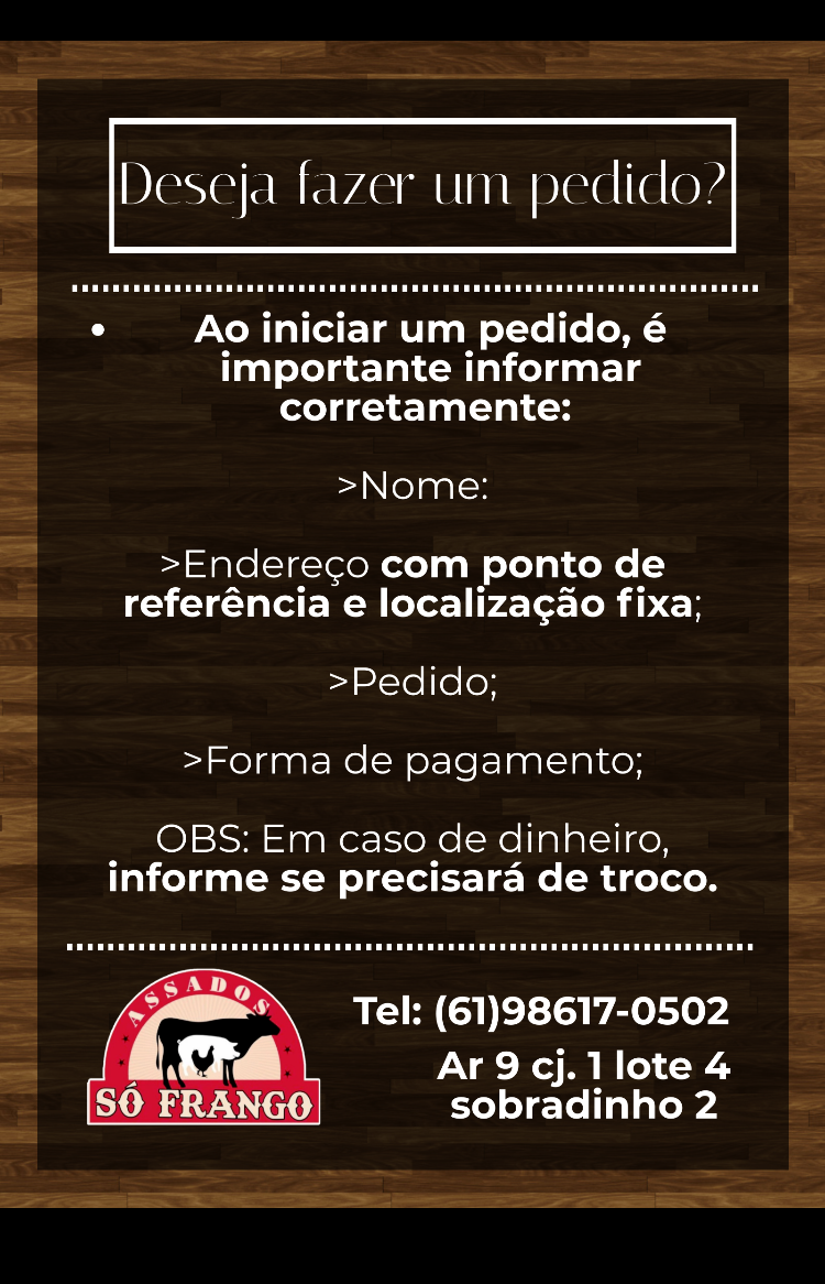 Introducing the menu at Assados Só Frango, a delightful chicken restaurant nestled in Sobradinho II, Brasília. This culinary gem specializes in mouth-watering roasted chicken and quality meats, complemented by a secret blend of spices that elevate every bite. Customers rave about the delicious flavors and attentive service that ensure a memorable dining experience.